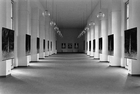 „ Zwischen hohen Fenstern, wie Unterrichtstafeln aufgehängt, geraten sie in Konfrontation zur Natur, aber mit ihr konkurrieren die Aufnahmen auch nicht. Die Schwarz- Weiß- Bäume demonstrieren vielmehr so etwas wie den Stillstand der Zeit. Es geht da um den einzelnen Baum und dessen Anderssein unter dem Einfluß des Lichts. Im Grunde focussiert sie hier die Einzelheit vor dem Hintergrund des Waldes, der wie eine schwarze Tiefe ausschaut und in Unbekanntes lockt... “